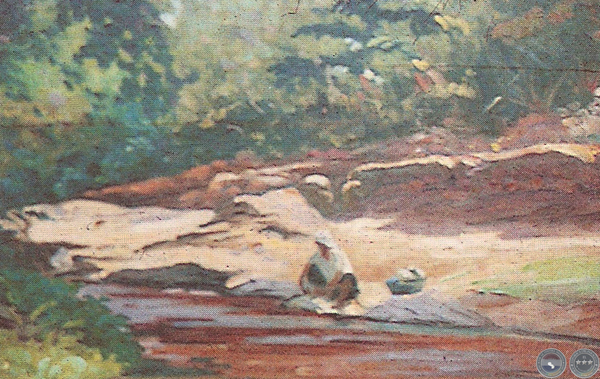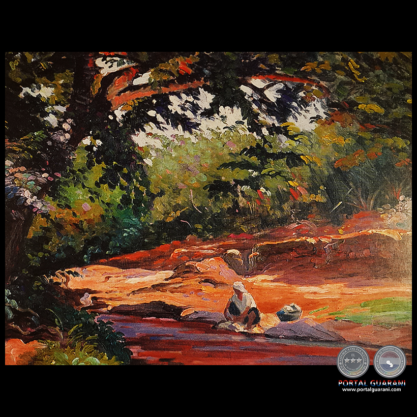 Paísaje con vegetación, arroyo y lavandera. Esta obra está construída en su totalidad por toques de color realizados con pinceladas densas y en general, cortas. Por esto se puede hablar de una verdadera "construcción cromática" al estilo de los pintores post-impresionistas, donde ya no existe el fondo y la figura, sino que toda la superficie es trabajada como un solo plano y la composición se basa en las relaciones de los colores entre sí.