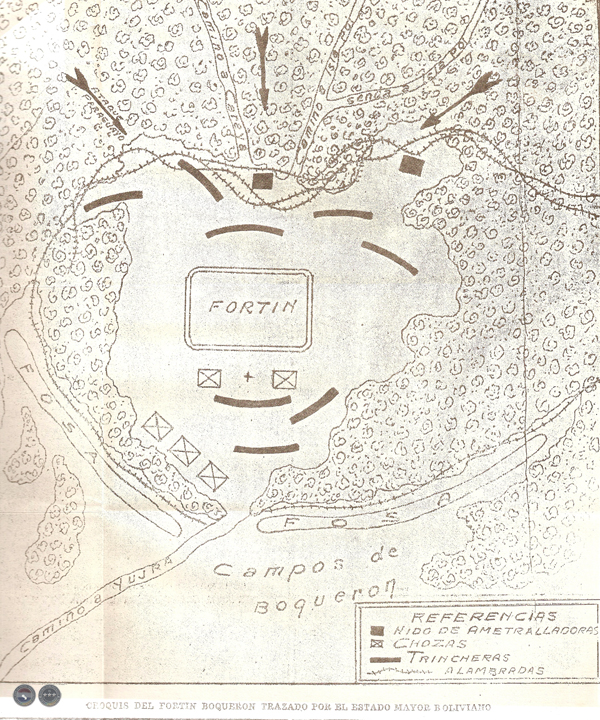 1.- El croquis boliviano de las posiciones de Boquerón, insertado en este trabajo, es incompleto. Probablemente, el Comandante del fortín, después de remitirlo al E. M., durante los primeros días del ataque paraguayo, fue mejorando y completando sus posiciones, adaptándolas a las situaciones cambiantes, que el enemigo fue creando. Sin embargo, los centros de resistencias, en general están bien ubicados; eso sí, los mismos estaban unidos entre sí, con zanjas de comunicaciones, encerrando así al fortín y sus instalaciones, en un reducto cerrado. Las fosas que aparecen al sur seguramente eran proyectos, que no se cristalizaron, las alambradas que figuren trazadas en todo el perímetro exterior, tampoco era cierta, posiblemente quedó en proyecto.