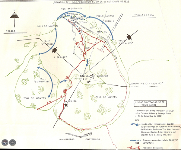 2.-El croquis de las posiciones bolivianas, -relevado por el Ing. Roque F. Zaldívar y los Cadetes Andrés Careaga Rojas y Julio Abbate, el día 29 de Setiembre de 1932, después de la rendición boliviana, es inédito, completo y preciso, en su frente E. N. y O. En los otros frentes, faltan detalles de las posiciones enemigas, tal como lo dicen sus autores pero es suficientemente detallado para el objetó de este trabajo.