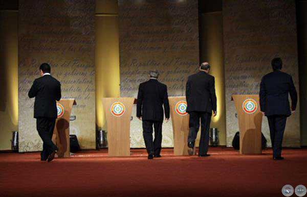 returns to their podiums for the start of a television presidential debate in Asuncion, Paraguay,