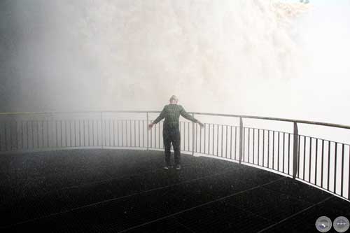 A tourist looks up into the spray of Iguazu Falls in Iguazu National Park in Brazil,