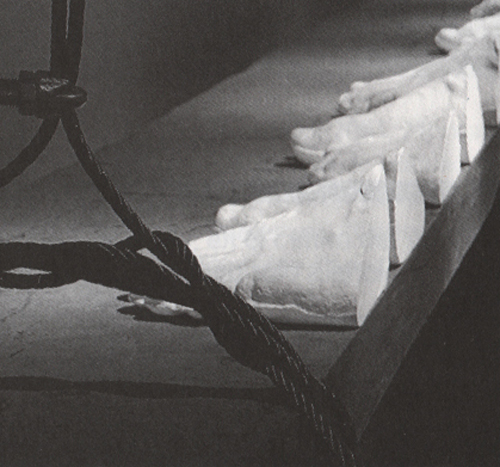 Los pies sobre el andamio son calcos de pies reales, de sujetos vivos, pero su referencia inevitable es la estatuaria académica; el andamio se refiere al trabajo de construcción en altura; sin embargo, no asciende ni desciende, mantiene la distancia del piso; su situación espacial fija no evita un tenue balanceo que puede producir una leve inestabilidad.