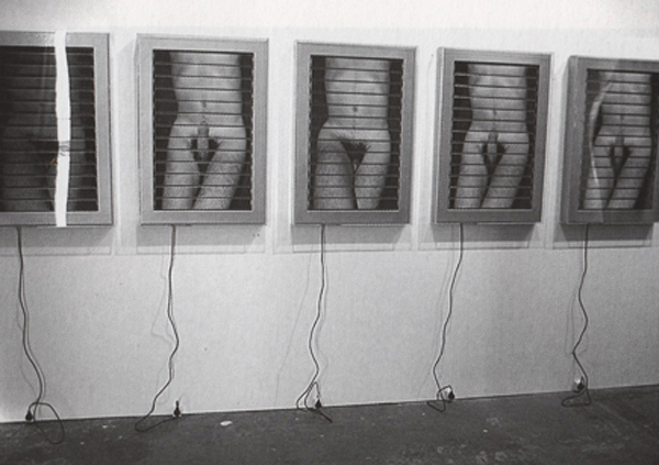 Los exhibidores publicitarios presentan alternativamente fotografías que en la alternancia modifican el cuerpo desplegado en el triédrico. Lo femenino señala el momento fálico: el cuerpo es asumido con el sexo erecto; lo masculino marca el instante de ocultamiento del pene entre las piernas. El tercer exhibidor, papel fotosensible quemado por la luz, anula el relevo y revelado de la imagen. Si las dos primeras representan el cuerpo en la ambigüedad de una identidad sexual difusa, cambiante, no sostenida en lo orgánico, sino en la percepción que se modifica en la mirada de los otros, la tercera trabaja sobre el concepto de cómo hacer que el vacío sea una forma que nos mire. Así, la imagen "negra" se sostiene en la experiencia del volumen (es decir, del tacto) que las dos primeras explicitan; de ese modo, la tercera imagen es una imagen del vaciamiento, potencia el vacío del sujeto ante el énfasis de la sexualidad. Sin embargo, el cuerpo mantiene en ambas imágenes un sutil contraposto, una forma serpentinata que remite a la tradición occidental de representación de la figura humana, a la par que la anula al negar la posibilidad del cuerpo perfecto que aquélla sostenía como ideal de belleza.