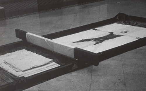 LAS SÁBANAS se relacionan con LA PILETA en la instalación de la BIENAL DE LA HABANA (1997); la batea aquí es de madera, cuadrada, y el cuerpo impreso ocupa ajustadamente el espacio bajo el agua, en eje visual con la imagen colgada. Otras sábanas cuelgan en las paredes, algunas con cuerpos impresos, otras en blanco, como aguardando. La espera es una de las etapas de la sumisión. Aquí no hay inscripción porque el cuerpo permanece aún sumergido. En la variación instalada en el Centro de Estudios Brasileños de Asunción (2000), el vínculo con LA PILETA se profundiza por la forma de la batea, el plástico negro que la cubre y la tela enrollada. Nuevamente es el cuerpo y no la escritura lo que la tela revela. Además, hay otras sábanas esperando apiladas a un costado. Lo central ahora es que el agua se ha evaporado o absorbido por las sábanas y ha dejado el cuerpo torturado expuesto, perdidas definitivamente sus proporciones por el dolor. El cuerpo cosificado.