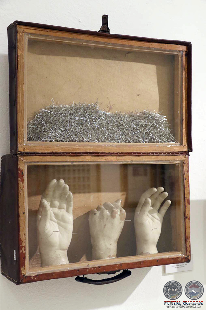En algunas de las obras conviven de forma caótica y armoniosa, objetos de uso común, con moldes de yeso, partes de otras obras y elementos de enorme fuerza como un candado, clavos y otros detalles.