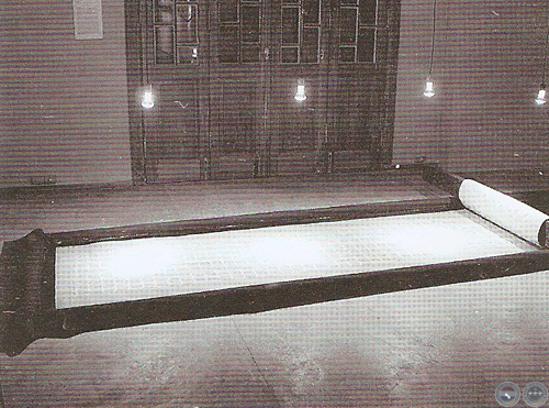 Bordada una y otra vez, la misma frase deviene, a su pesar, ornamento realzado, banal referencia a la manualidad más inocente. Plegado, dispuesto pulcramente de acuerdo a un espacio rectangular y alargado, el lienzo sugiere ahora un sudario pero también un mantel demasiado blanco de recuerdos zurbaranescos. Pero en el contexto de la poética de Salerno, ya lo sabemos, el pliegue y el doblez, así como la vuelta de la hoja o la tela sobre sí, aluden a la blancura expectante del soporte. Y mentan aquel otro esquema que, trazado en secreto por los pliegues, aguarda una escritura nueva. O espera acoger el recuerdo que reflote desde el fondo de una historia que no puede ser olvidada. Quizá el recuerdo de una escritura usurpada: el artista parte no sólo del discurso de Roa sino de la propia caligrafía del escritor que hace suya; que reescribe con su letra y reitera con obsesión a través del bordado. Que ahoga y silencia las palabras contraescribiéndolas en blanco. Una vez más, el escrito ha sido traicionado, adulterado en su destino de aforismo, convertido en gala del lienzo elemental o atavío del último paño. Una vez más, el texto se vuelve ilegible. Y demanda una reinscripción que trastorne el registro de la escritura y presente a ésta en clave fantasmática. En clave de imagen que regresa borrada, mojada.