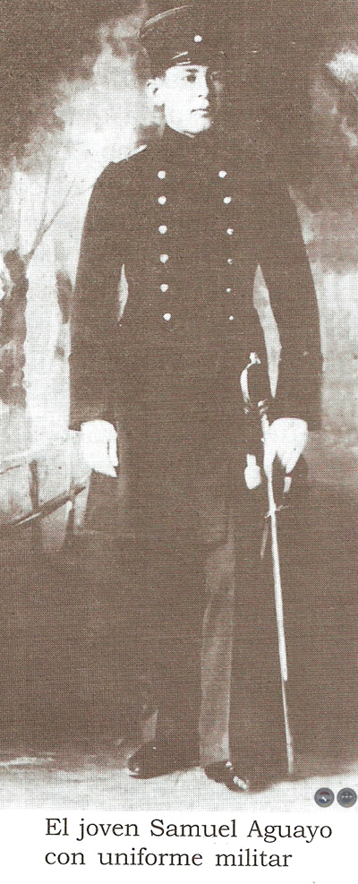 Samuel Aguayo, obligado por la tradición, debía dedicarse a la carrera de las armas. Y siguiendo una costumbre corriente en el país, el padre lo «colocó» desde muy joven en el cuartel, para que se fuera amoldando al espíritu de la disciplina y el respeto. Allí obtuvo el brevet de aviador, y se convirtió al mismo tiempo en excelente mecánico.
