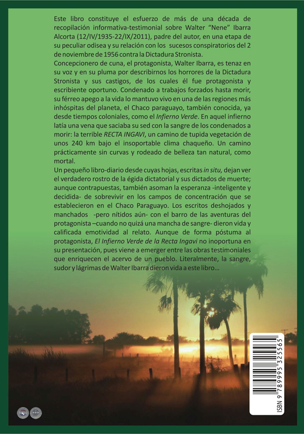 Aunque de forma póstuma al protagonista, El Infierno Verde de la Recta Ingavi no inoportuna en su presentación, pues viene a emerger entre las obras testimoniales que enriquecen el acervo de un pueblo. Literalmente, la sangre, sudor y lágrimas de Walter Ibarra dieron vida a este libro…