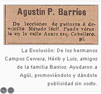 Nuestro magnífico artista, antes de su primer viaje al exterior en el segundo semestre de 1909, recibió a través de sus amigos unos avisos publicitarios graciables, ofreciendo sus cátedras musicales a domicilio (ver recuadro). Barrios ya iba convirtiéndose en el ejemplo a seguir. Restablecido del impacto emocional por el fallecimiento de su padre, Agustín consideró la necesidad de buscar otros horizontes, nuevas alternativas para mitigar el ancestral mal de la difusión y creación de su arte: la pobreza económica.