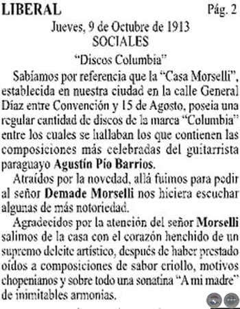 Por entonces, en Asunción se sabía solo de la música impresa en el papel. Los maestros músicos viajaban a Buenos Aires para editar sus partituras a fin de legarlos a la posteridad. Estas representaban material de exclusivo consumo profesional y accesible solo para eruditos. Pero cuando aparece la grabación magnetofónica se produce la primera gran revolución en la impresión musical que rápidamente se masifica y se comercializa en cualquier tienda a un precio accesible, convirtiéndose en producto estándar para neófitos e ilustrados indistintamente. Después de las famosas “cajas musicales” de Madame Elisa Lynch, las únicas que disponía el Paraguay entre 1855 y 1870, se introdujeron oficialmente en Asunción el fonógrafo de Thomas Edison en 1893 y posteriormente el cinematógrafo. En el año 1913, la “Santería D. Morselli” importó, para su venta, la primera grabación realizada por un músico paraguayo. El hecho fue algo insólito que conmovió el ambiente aldeano de Asunción, “lujoso” espectador de la dinámica de todo el orbe.