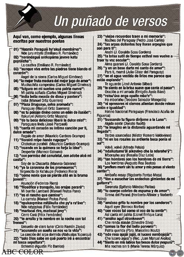 Sin embargo, gracias a nuestro favorable destino de poseer dos "poéticos" idiomas, uno de ellos ancestral, es que el "inventor de fábulas" dispone de una herramienta inconmensurable, pues, el matiz idiomático resulta ilimitado para las conversiones e inversiones, mediante las cuales los hacedores de la destreza recurren a la consabida virtud de expresar con exactitud un acontecimiento coyuntural, ya sea simple o complejo. De ahí nació el "jopara" (mezcla del atávico guaraní con el castellano), que tiene como figura cumbre a Emiliano Rivarola Fernández, notable creador, un virtuoso y atractivo manipulador del idioma que hizo añicos de todos los esquemas que rigen la idiomática, ya que su pujanza y profundidad vienen del alma sensible fruto de la tierra madre y de la iluminación divina. No podemos soslayar a un gigante como Félix Fernández, quien hizo gala de buena música y de letras autóctonas capaces de seducir a la misma piedra o de explicar la profunda naturaleza del "ser paraguayo". Del mismo modo, aflora el eco sensitivo de los explotados en un Teodoro Salvador Mongelós, verdadero mago y patriota que amó profundamente su tierra exaltando las virtudes de su gente.
