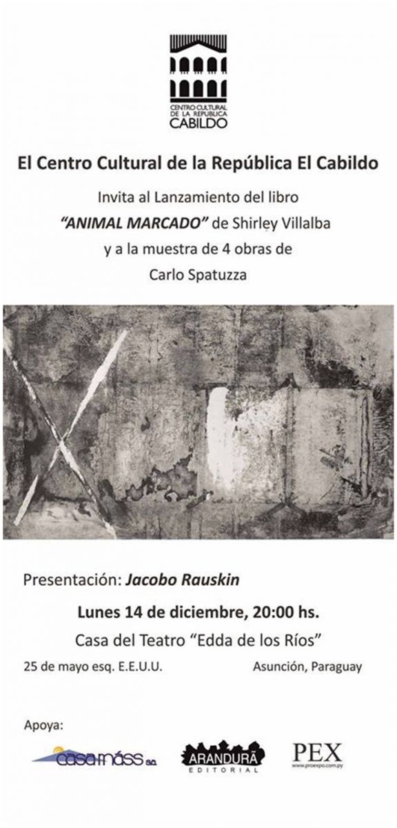 El Centro Cultural de la República El Cabildo invita a la presentación del libro “Animal marcado” de la autora Shirley Villalba; así como a la muestra de obras del artista CARLO SPATUZZA, este lunes 14 de diciembre, a las 20:00, en la Casa Bicentenario del Teatro “Edda de los Ríos” (25 de Mayo casi Estados Unidos), con acceso libre y gratuito. La presentación del libro, editado bajo el sello Arandurâ, estará a cargo del escritor JACOBO RAUSKIN.