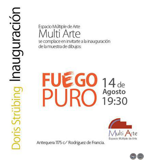 El jueves 14 de agosto (2014), a las 19:30 hs., se inauguró la muestra titulada “A Fuego Puro” en MultiArte, Espacio Múltiple de Arte (Antequera casi Gaspar Rodríguez de Francia). Dicha muestra se compone de de dibujos trabajados en la técnica del pastel sobre cartulina, algunos con incorporación de inscripciones con bolígrafos, donde el tema central son miradas que reflejan distintas emociones o estados.