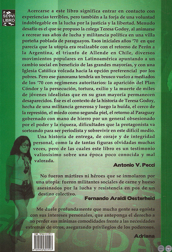 Este libro marca la voz de Tere en la concepción de su historia, con una redacción que nos va dirigiendo hacia un relato sobre el que creíamos estaba todo ya contado. Con el arma minuciosa de la verdad, recapitula el teatro de las acciones violentas en la Argentina y en América Latina, la Operación Cóndor, y también instruyendo, tratando de escaparse de los vacíos en una narración en la que es visible la manera en que limó sus escritos partiendo de un estudio que averiguó lo sucedido con sus compañeros de causa: la lucha por la libertad, la justicia, el honor, en Argentina y Paraguay.