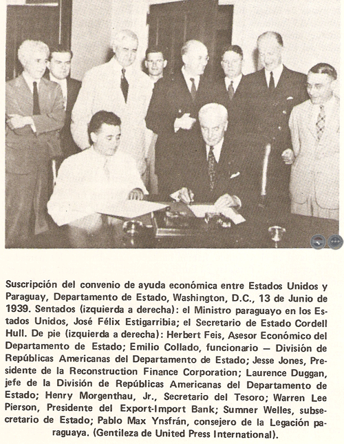 La evaluación de Estigarribia de la probabilidad de una cooperación de los EE.UU. estaba bien fundada. Los diplomáticos estadounidenses en el Paraguay habían descripto la revolución de Franco en 1936 como una expulsión de los "elementos más substanciales y de pensamiento sobrio en el país" por parte de "hombres por lo general sin experiencia, muchos de ellos... de tendencias claramente radicales", y el Departamento de Estado había celebrado el retorno de los liberales al poder en 1937 como "una evolución política estabilizante".32 Tanto Roosevelt como su principal asesor sobre asuntos latinoamericanos, el Subsecretario de Estado Sumner Welles, estaban particularmente impresionados por la personalidad de Estigarribia como "hombre inteligente y de pensamiento constructivo" que tenía "deseos muy sinceros de cultivar relaciones políticas y económicas más estrechas con los Estados Unidos". De este modo, cuando Estigarribia presentó su solicitud de asistencia, el Departamento de Estado urgió activamente al Export-Import Bank que respondiera favorablemente, pasando por alto la conclusión de su propio asesor sobre asuntos económicos internacionales, en el sentido que "desde un punto de vista económico" la propuesta paraguaya era "en el mejor de los casos de recomendabilidad dudosa" y citando en lugar de ello "varias pruebas de actividad europea en el Paraguay en este momento", "el calibre de los funcionarios que estarán a cargo del programa de desarrollo", y el deseo del gobierno de ayudar a Estigarribia "a desviar el pensamiento del pueblo [paraguayo] de otras cosas" como razones para otorgar la asistencia.33 Como resultado, las negociaciones preliminares hacia un convenio de ayuda siguieron adelante sin obstáculos. Para Marzo de 1939, Estigarribia estaba recurriendo dinámicamente a su popularidad en Washington para fortalecer su campaña por la nominación presidencial del Partido Liberal, advirtiendo a los líderes liberales que los créditos norteamericanos serían concedidos únicamente si él tenía la seguridad de ser el próximo presidente paraguayo. Entretanto, las autoridades de los Estados Unidos estaban observando atentamente para ver "si el general es lo suficientemente fuerte para... emerger ileso como el salvador del Paraguay con la ayuda norteamericana".34