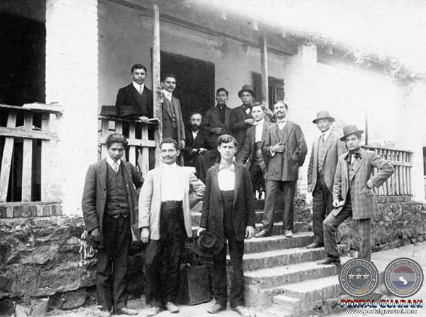RAFAEL BARRETT (sentado), rodeado de sus amigos sindicalistas, en San Bernardino, Paraguay, 1910.