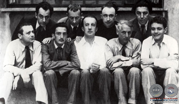 1930. Desde la izquierda: atrás Man Ray, Arp, Yves Tanguy, Breton; adelante, Tzara, Dali, Eluard, Max Ernst, Rene Clevel.