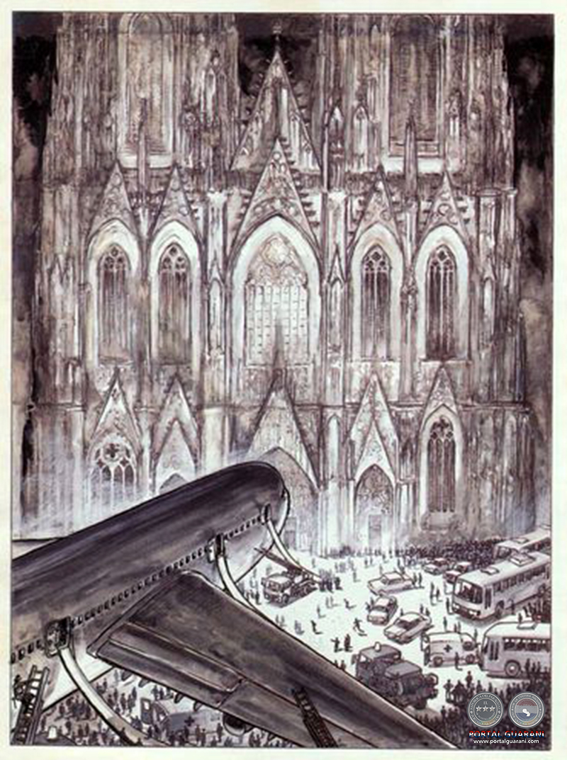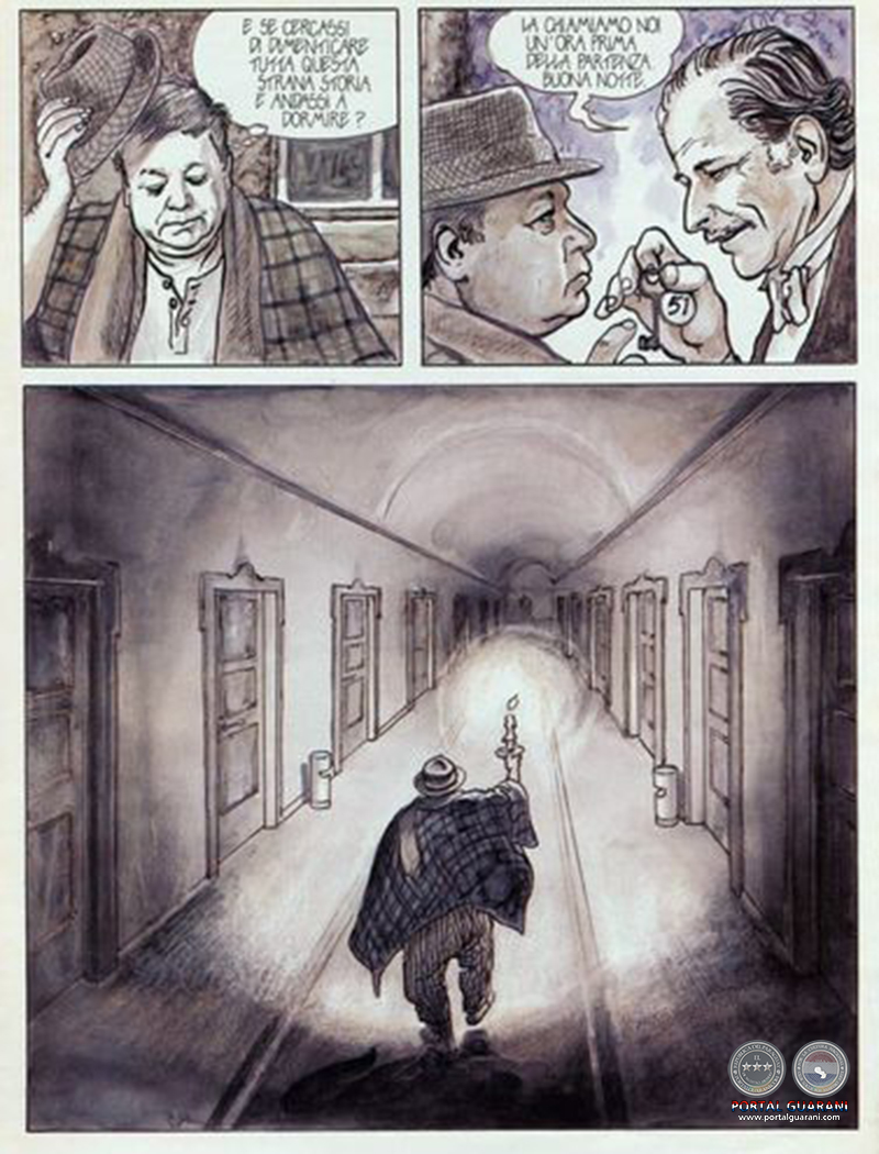 El extraño viaje de Domenico Nolo, el extraño viaje de Guido Mastorna, el extraño viaje de Federico Fellini. Quizá su ingreso en el hospital le haya parecido a Fellini una confirmación de los lúgubres presagios que asociaba a este proyecto. «El viaje de G. Mastorna trata de la muerte», dijo a L’Express en 1969. «Pensé que mi curiosidad estaba siendo castigada. Que había tocado una puerta que se estaba cerrando sobre mí». Mastorna es un violonchelista cuyo avión, milagrosamente, consigue aterrizar en medio de una terrible tormenta, en una plaza dominada por una enorme catedral gótica. Es llevado a un hotel en medio del bosque, en cuyo salón disfruta del espectáculo brindado a los presentes por una bailarina a la luz de las velas –hay un apagón esa noche de su llegada– antes de tomar su llave y retirarse a su habitación, donde, cuando vuelve la luz, enciende el televisor. En un noticiero, la locutora informa, en alemán (vemos la traducción fuera del espacio de las viñetas –no la «ve», pues, Mastorna–, en el borde inferior de la página), sobre un accidente aéreo en las montañas, sin sobrevivientes. Mastorna recorre esa ciudad desconocida, donde todo es familiar pero nada tiene sentido: ruidosas multitudes apiñadas en las calles caóticas entre carteles publicitarios indescifrables, templos para todas las religiones, bares, burdeles, decadentes teatros. Tal es el escenario de la metafísica errancia del náufrago, que poco a poco, a medida que se va internando en esa extraña dimensión, oscura y grotesca, comprende que no ha sobrevivido al accidente aéreo.