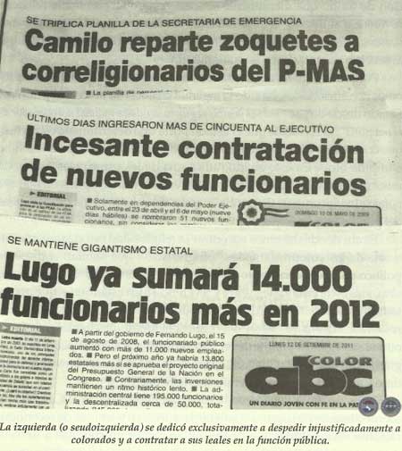 Si el stronismo utilizaba ayer el comunismo como un estigma para deshacerse de sus adversarios políticos, hoy, el luguismo pretende predisponer a la sociedad en contra de todos aquellos que piensan diferente, acusándolos de reaccionarios, derechistas, conspiradores, golpistas o enemigos de un cambio que sólo existe en la mentalidad autocomplacida de sus propagandistas.