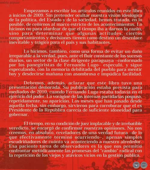 Debemos, además, aclarar que este libro tuvo una presentación demorada. Su publicación estaba prevista para mediados de 2010, cuando Fernando Lugo estaba todavía en el ejercicio del poder. La vorágine de las internas partidarias pospuso, repetidamente, su aparición. Los meses que han pasado desde aquella fecha, sin embargo, sirvieron para corroborar que el ex Presidente de la República carecía de suficiente idoneidad para gobernar.