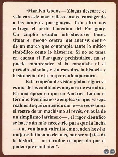 Marilyn Godoy— Ziogas descorre el velo con este maravilloso ensayo consagrado a las mujeres paraguayas. Esta obra nos entrega el perfil femenino del Paraguay. Un amplio estudio introductorio busca situar el meollo central del análisis dentro un marco que contempla tanto lo mítico simbólico como lo histórico. Si no se toma en cuenta el Paraguay prehistórico, no se puede comprender ni la conquista ni el período colonial, y sin esos dos, la historia y la situación de la mujer contemporánea.