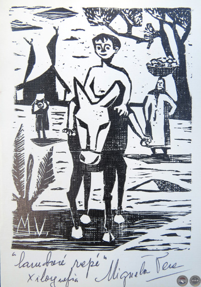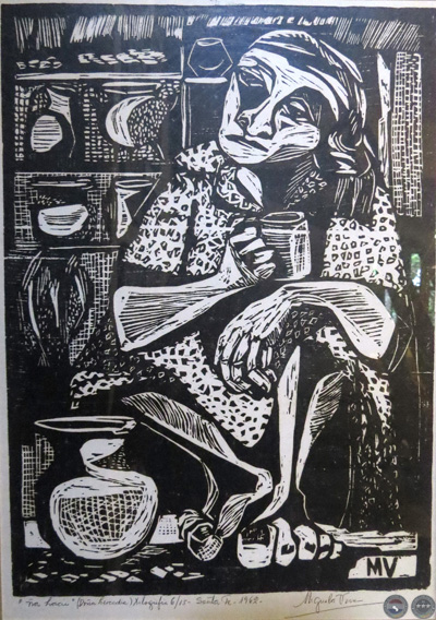 Miguela Vera– Era una mujer paraguaya que siempre se definió a sí misma como tal. Su tarjeta de presentación mostraba el xilograbado de una mujer pisando en el típico angu’a-paraguay: paraguaya, trabajadora y xilógrafa. De hecho, la nostalgia de la patria marcó toda su obra, que fue construida en base a la memoria, a vivencias y personajes que fueron plasmados como testimonio del hombre popular de este país, donde la urgencia expresiva, clara y contundente se traduce en un estilo fuerte, esencial, altamente sintético y expresivo. En sus mujeres, a veces con presencia de colores fuertes, con una visión absolutamente introspectiva, produjo estampas bellamente expresivas, donde vio y se vio a sí misma, y marcó una presencia importante en el arte paraguayo.“