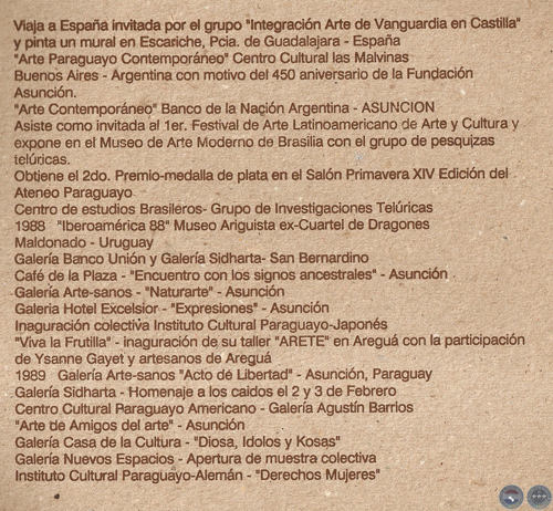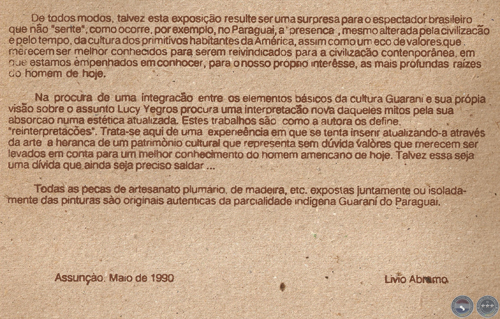 "Sobre diversos soportes Lucy Yegros, como en invitación a la danza ritual, nos lleva de la mano a su mundo de sueños, a la búsqueda de un tiempo en el que el hombre era rico; rico porque era capaz de comunicarse con la naturaleza toda; rico porque era capaz de soñar ...