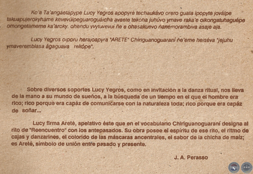 Lucy firma Areté, apelativo éste que en el vocabulario Chiriguanoguaraní designa al rito de "Reencuentro" con los antepasados. Su obra posee el espíritu de ese rito, el ritmo de cajas y danzarines, el colorido de las máscaras ancestrales, el sabor de la chicha de maíz, es Areté, símbolo de unión entre pasado y presente" - J.A.PERASSO
