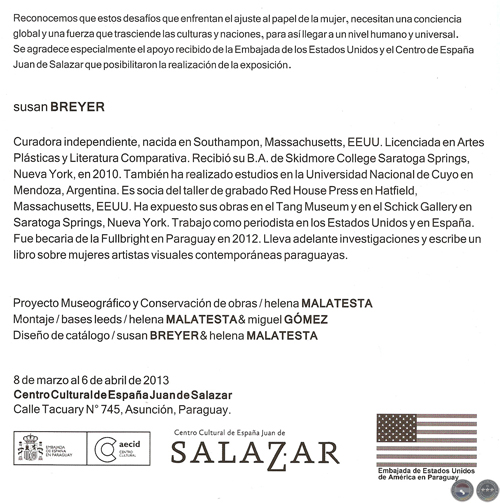 BETTINA BRIZUELA: Nace en Asunción en 1969. Asiste a los talleres de Livio Abramo en el Centro de Estudios Brasileños y al ISA de la Universidad Nacional de Asunción. Expone desde el año 1985 en el país y en el extranjero. Entre sus últimas exposiciones destacan en el 2011: En Tránsito 3, Viaje a la Aurora Boreal, Centro Cultural de España Juan de Salazar, Asunción; en el 2010: Paraguay Esquivo colectiva, Privadísimo, Festival de Imaginaire, París; MAC Centro Dragaõ Do Marde Arte e Cultura Colectiva Pra Começo do Século Objetos y Obos, fotografías y vídeo en colaboración con Laura Mandelik, Fortaleza; en 2007: 20 Instants video numeriques et poetiques, París, Lo inefable, Planta Alta, Asunción, Homage to domestic familiarity, Anaya Tish Gallery, Houston-Texas. Ha obtenido premios y se han realizado publicaciones sobre su obra.