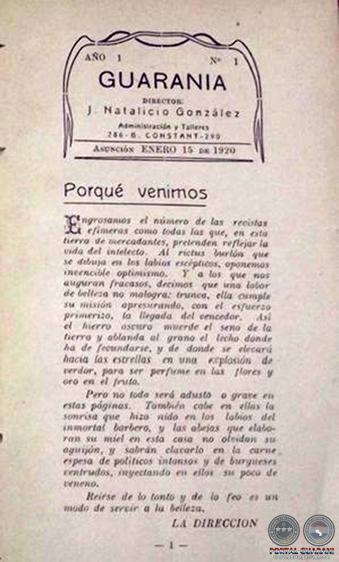 La revista Guarania celebra este año su primer siglo. El 15 de enero de 1920 salía a luz el primer ejemplar, bajo la dirección del escritor y político Juan Natalicio González (1897-1966). Con motivo de este importante aniversario, los días 4 y 11 de setiembre se realizará un ciclo de conferencias en línea con la participación de destacadas personalidades del ámbito cultural paraguayo. Los dos encuentros serán transmitidos online desde el Ateneo Paraguayo, entidad que respalda el evento, y la coordinación y moderación de las charlas estará a cargo del escritor Cristino Bogado, que, a propósito de este centenario, comenta: «Hablar de Guarania es hablar de Natalicio, figura que merece una relectura crítica ahora que las anteojeras ideológicas o la simple animadversión que impedían su exégesis clara han remitido. Llegó a ser una revista de gran alcance, la más importante del siglo XX, al decir de una de sus investigadoras más conspicuas. En ella han aparecido una gran cantidad de referentes culturales, tanto nacionales como internacionales, en diversos ámbitos, por lo que acceder a sus publicaciones resulta un ejercicio estimulante. Ojalá este encuentro ayude a que surja la voluntad de digitalizar todos sus números». Consultado por el nombre de la centenaria publicación, aclara: «Tanto la revista como el género musical (patentado cinco años después por José Asunción Flores, pero cuyo nombre fue sugerencia de Manuel Ortiz Guerrero) llevan el mismo nombre, Guarania, y es que tanto el fundador de una (Natalicio González) como el letrista del otro (Ortiz Guerrero) son oriundos de Villarrica del Espíritu Santo, y amigos de la infancia».