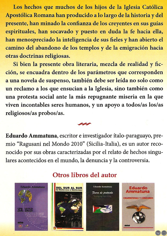Si bien la presente obra literaria, mezcla de realidad y ficción, se encuadra dentro de los parámetros que corresponden a una novela de suspenso, también debe ser leída no solo como un reclamo a los que ensucian a la Iglesia, sino también como una protesta social ante la más repugnante miseria en la que viven incontables seres humanos, y un apoyo a todos/as los/as religiosos/ as probos/as.