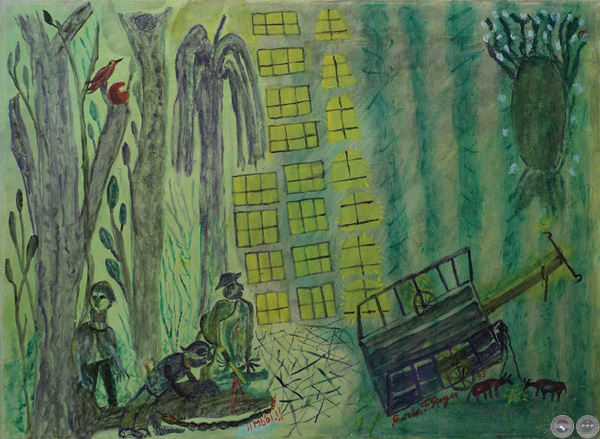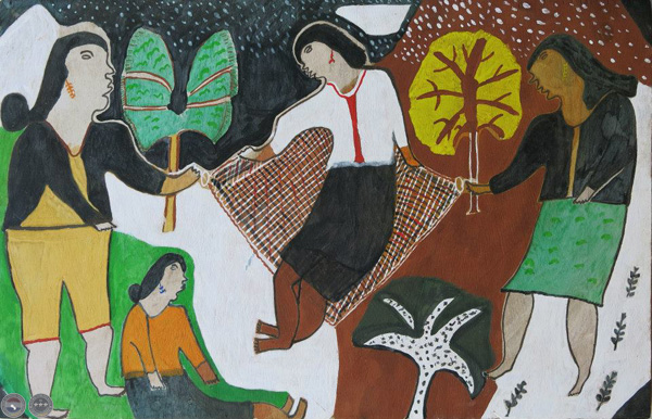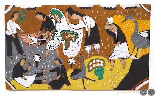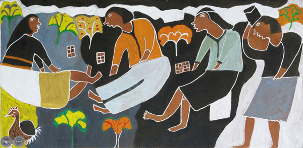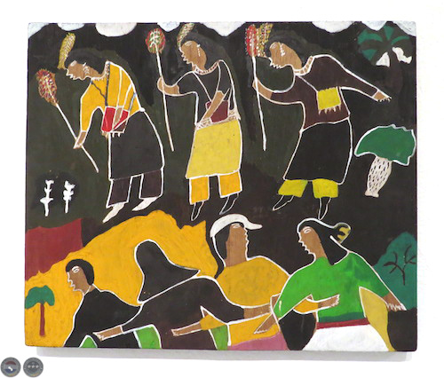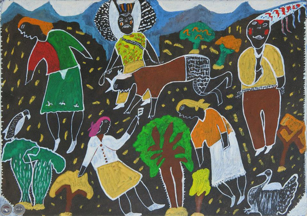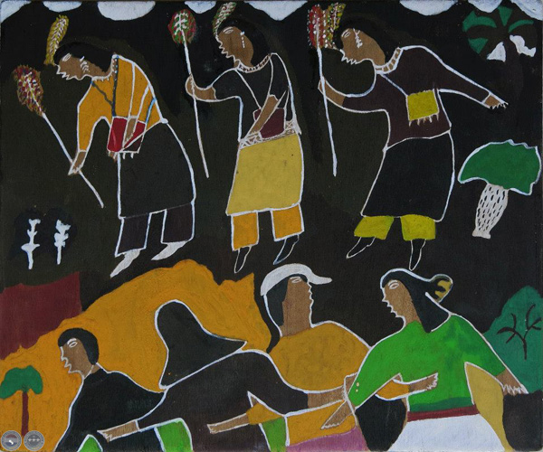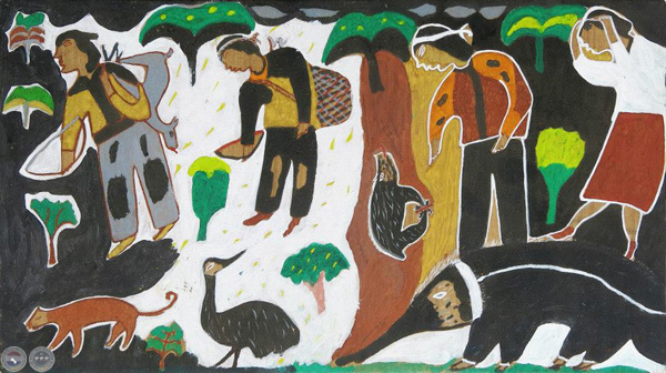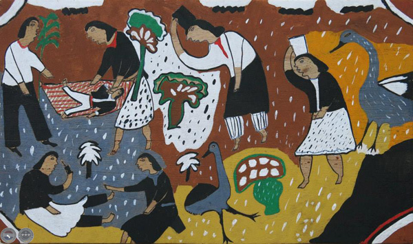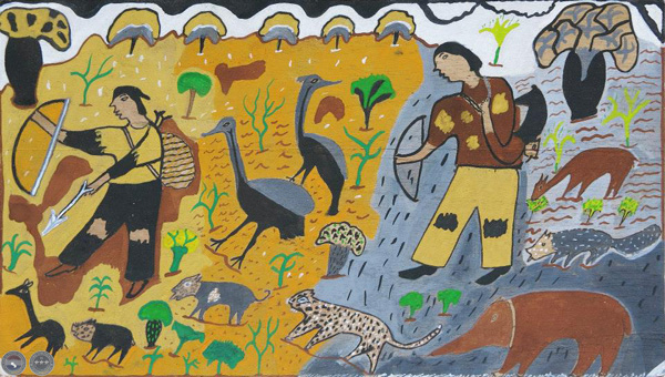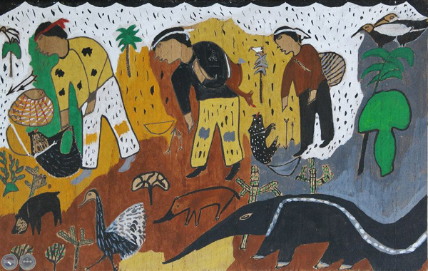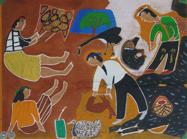 En el segundo escenario, artistas indígenas incorporan técnicas, imágenes y usos modernos ya sea para reponer sus menguadas iconografías, ya para oxigenarlas con refuerzos nuevos o, directamente, para explorar fuentes subsistenciales alternativas. En este ámbito resulta relevante la figura de Osvaldo Pitoé, que ha iniciado con notables resultados la práctica de la pintura sobre tablas de manera. Sus imágenes representan visiones del mundo, vivencias personales y comunitarias y anécdotas e historias que no han sido registradas por los propios indígenas. Sus obras no sólo poseen un indudable valor estético, sino que devienen valiosa información endoetnográfica y testimonio de diversos movimientos de reajuste que debe realizar la cultura indígena para sobrevivir y desarrollarse.”