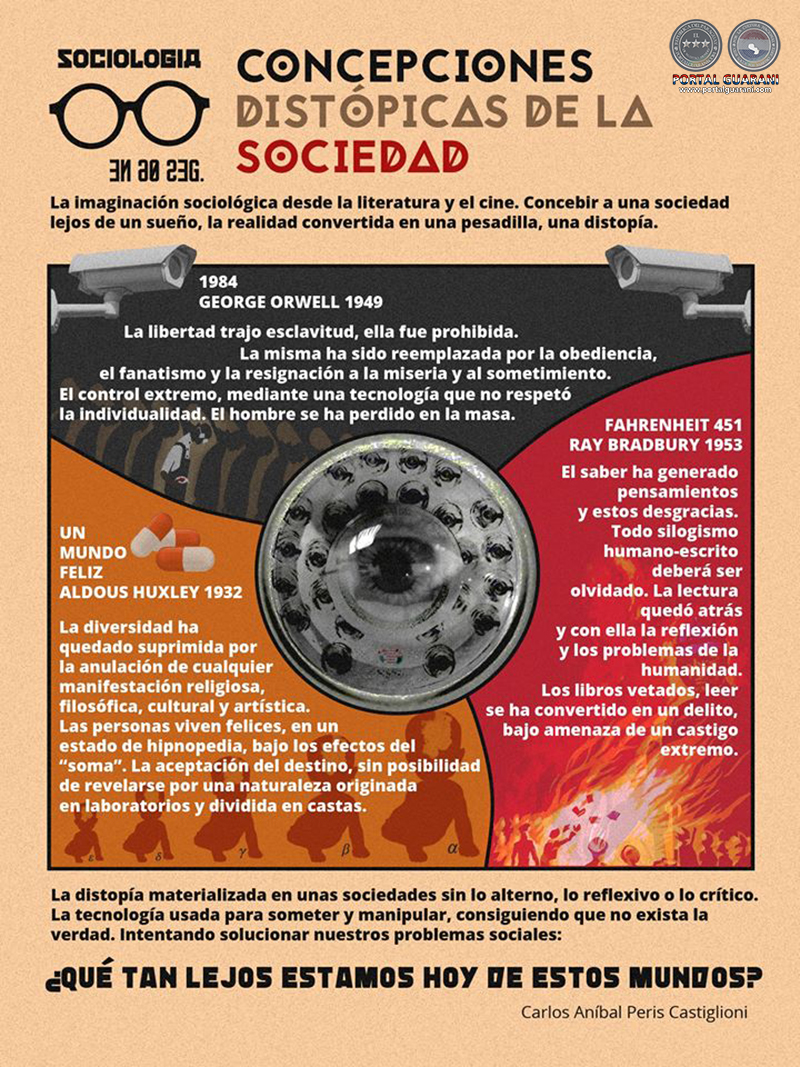 Las novelas Un mundo feliz (Aldous Huxley, 1932), 1984 (George Orwell, 1949) y Fahrenheit 451 (Ray Bradbury, 1953) se han convertido en excelentes ejemplos de lo recién asentado. Estos escritos, en base a hechos ocurridos en el pasado y al avance tecnológico por los que tales intelectuales han atravesado, mostraron posibles escenarios distópicos en los que se podría llegar a terminar. Mediante diversas tramas, pensaron en un desenlace organizacional que se ha convertido en una pesadilla, muy lejos del sueño anhelado.