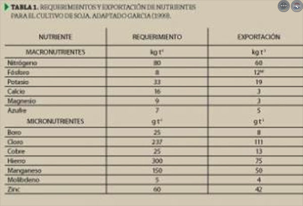 El objetivo de una fertilización es satisfacer los requerimientos de nutrientes del cultivo, en las situaciones en las cuales el suelo no puede proveerlos en su totalidad, y así aumentar los rendimientos. La Tabla 1 muestra los requerimientos de nutrientes para el cultivo de soja.