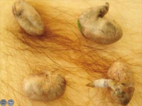 COMPLEJO DIAPHORTE-PHOMOPSIS. Este deterioro de semillas resulta cuando el hongo que causa tizón de la vaina y del tallo se mueve desde estos órganos hasta la semilla, es la enfermedad más importante asociada con el deterioro de las semillas en el campo y se incrementa con el aumento de la humedad, especialmente durante la formación de las vainas y con la madurez fisiológica y de cosecha, afecta gravemente la calidad de la semilla debido a los efectos sobre el proceso de germinación.
