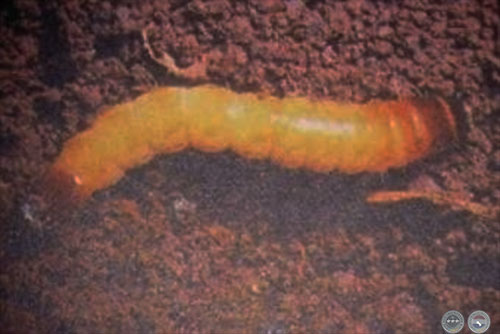 Gorgojo de suelo (Pantomorus sp. Col. Curculionidae). A medida que se desarrollan afectan más profundamente el sistema radicular y las coronas de algunas especies ocasionan galerías. Las larvas se alimentan de semillas y/o bien de las raíces. En el cultivo generalmente los daños se observan hasta cuatro semanas después de la siembra, en ataques severos provocan la muerte de las plantas. Cuando atacan plantas mayores el daño disminuye y las mismas pueden recuperar el vigor.