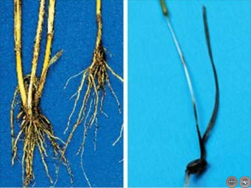Las semillas infectadas y los conidios en el suelo son las principales fuentes de inóculo. Los síntomas más comunes consisten en decoloración de tejidos radiculares, que se tornan pardos principalmente el entrenudo sub-coronal, en contraste con el mal del pie, que causa pudrición negra de las raíces. Las principales medidas de control de esta enfermedad es el tratamiento de semillas con fungicidas y la rotación de cultivos.