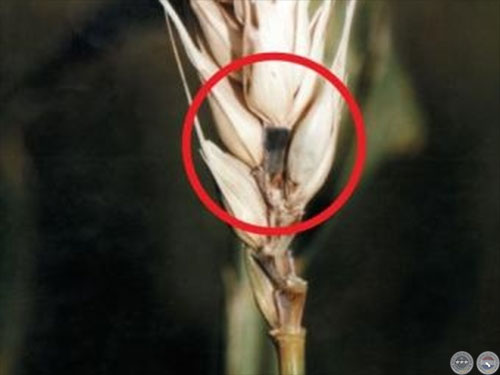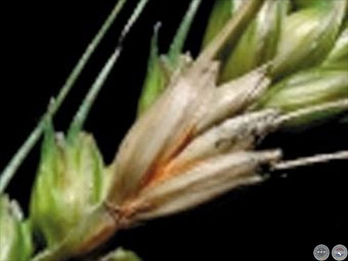 Los síntomas se caracterizan por la infección de espiguillas, que con la evolución de la colonización del hongo se presentan despigmentadas de coloración blanquecina. Los granos se pueden desenvolver presentando un aspecto arrugado de coloración rosada por causa de la presencia del micelio del hongo. Las medidas de control del hongo son: cultivares tolerantes, escalonamiento en la siembra y pulverización aérea sobre las espigas en la etapa de floración.