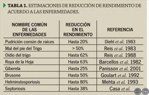 Las enfermedades varían con respecto a los órganos que afectan, a la difusión que alcanzan, a su frecuencia de aparición a través de los años y a los efectos que ocasionan sobre los rendimientos. En la Tabla 1 se presenta un cuadro con las estimaciones de reducción de rendimiento de acuerdo a las enfermedades.
