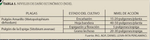 El pulgón verde de los cereales (Schizaphis graminun) ataca al trigo desde su nacimiento hasta la encañazón; y se ubica en el envez de las hojas. Los mayores daños se observan durante las dos semanas posteriores a la emergencia de las plántulas. El umbral económico para la toma de decisión de control químico es de tres a cinco pulgones por planta en la primera semana posterior a la germinación y, a partir de ahí, 15 pulgones por planta. (INTA Manfredi, José Imwinkelried) (Tabla 1).