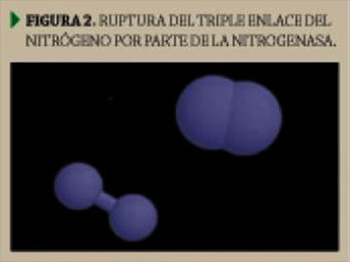 c,d,e,f) Desarrollo del nódulo. Los primeros pasos que se conocen es la segregación de fitohormonas como citoquininas y auxinas por las bacterias que inducen una proliferación celular. Hay otros factores de crecimiento desconocidos que se difunden por el xilema. Se sabe que en los siguientes pasos tienen lugar la formación de la enzima Nitrogenasa,que se encargará de romper el triple enlace del nitrógeno (Figura 2).