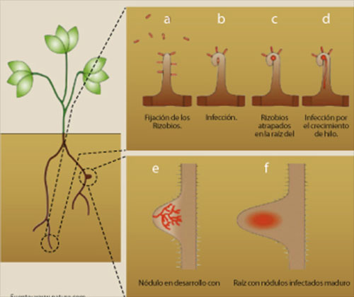 Fijación simbiótica en leguminosas. Uno de los puntos más importantes dentro de la fijación biológica del nitrógeno es el de la simbiosis entre leguminosas y bacterias del género Rhizobium. La manera en que se produce la infección y como los factores ambientales intervienen y alteran la simbiosis son importantes.