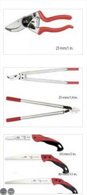 Seguir la regla básica de selección de herramientas, iniciar las podas con tijeras sin los diámetros de ramas superan la abertura de boca es el momento de los serruchos.