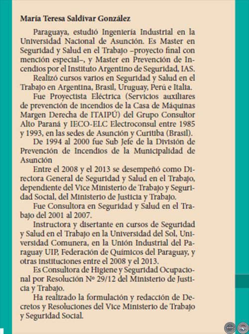 En ese sentido puede catalogarse como ambiciosa a esta publicación, ya que constituye una primera aproximación –sin desestimar los esfuerzos realizados por un sinnúmero de personas tanto en forma individual y colectiva–, para reunir en un solo cuerpo la legislación laboral vigente en el Paraguay relacionada a los riesgos laborales. En la misma, se agrupa dicha normativa considerando las fundamentales que establecen la seguridad y salud en el trabajo como derecho laboral, siguiendo con mujeres y adolescentes; quienes, por circunstancias de pobreza, origen étnico, estado de salud, edad, género o discapacidad, se encuentran en una situación de mayor indefensión para hacer frente a los problemas que plantea la vida y no cuentan con los recursos necesarios para satisfacer sus necesidades básicas, padeciendo una situación de desventaja en el ejercicio pleno de sus derechos y libertades; el sector de transporte porque los riesgos a los que se exponen los trabajadores también pueden afectar a los usuarios; así como también otras legislaciones clasificadas según tipo de riesgo y algunas complementarias.
