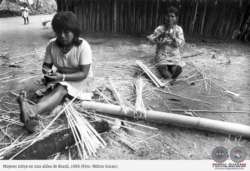 En una versión del mito contada al autor de estas líneas por el líder de la comunidad Ka’aguy Pau, de Caazapá, Reginaldo Orvina, se cuenta el origen de dos humanidades: la de los mbya y la de los paraguayos-karairã (2), siendo este el origen de las diferencias entre ambos grupos: «Al principio vinimos dos. Karairã les llamamos a ustedes. “Paraguayos” y “karairã” son la misma cosa. Y vinimos los mbya y los karairã. karairã vino sobre una sábana limpia. Él nació sobre una sábana limpia. El mbya, en cambio, nació sobre hojas de la palma pindó. De este modo, hasta ahora, continuamos de esta manera. Entonces, estamos entre dos [grupos]. Los paraguayos y los indígenas. Nos han enviado [a la tierra] diferentes. A nosotros se nos envió para que vayamos al opy (3) para tener salud. Ustedes tienen, igualmente, su iglesia. Muchas cosas tienen, pero diferentes. Se nos envió diferentes. Ustedes también bautizan. Nosotros la misma cosa. A nosotros, nuestros karaia (4) nos dan siempre nuestros nombres» (Reginaldo Orvina, Ka’aguy Pau, 2/10/2011).