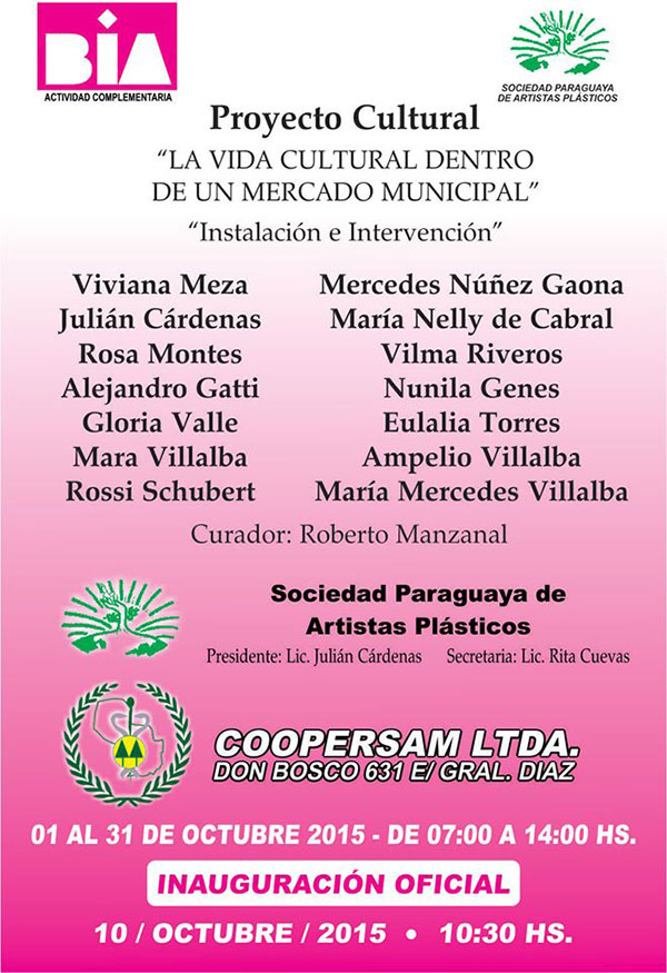 El sábado 10 de octubre, a las 10:30 hs se inauguró oficialmente la exposición titulada “La vida cultural dentro de un mercado municipal” de la Sociedad Paraguaya de Artistas Plásticos en el marco de la 1ª Bienal Internacional de Asunción en la Coopersam Ltda. (Don Bosco 631 esq. Gral Diaz, Asunción). La muestra consiste en una instalación - intervención, donde cada autor recrea lo aspectos relacionados al mercado con la curaduría de Roberto Manzanal. En dicha ocasión también recibió un homenaje especial a una de las trabajadoras, Doña Marcelino Almeida, del Mercado Municipal Nº 2 por sus 66 años de dedicación al trabajo y sustentó a su familia con la dignidad que caracteriza a la mujer paraguaya. Además, también fue entregado un reconocimiento a Roberto Manzanal, por ser Socio Fundador y Curador de la Sociedad Paraguaya de Artistas Plásticos (SPAP).