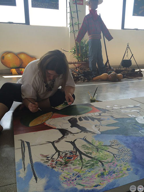 La artista María Mercedes Villalba trabajando en la intervención colectiva.
