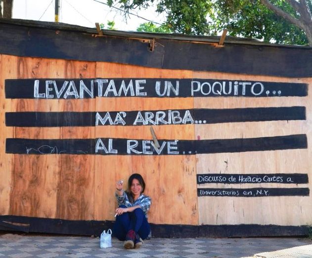 La obra distinguida en esa ocasión –«Telepromter», de Ruth Estigarribia– consistió en la transcripción de equívocos o frases «políticamente incorrectas» (llamémoslas así) formuladas por el Primer Mandatario de la República, que fueron pintadas en los muros de las precarias viviendas que actualmente se ubican en las plazas del congreso a consecuencia de la crecida del río Paraguay.