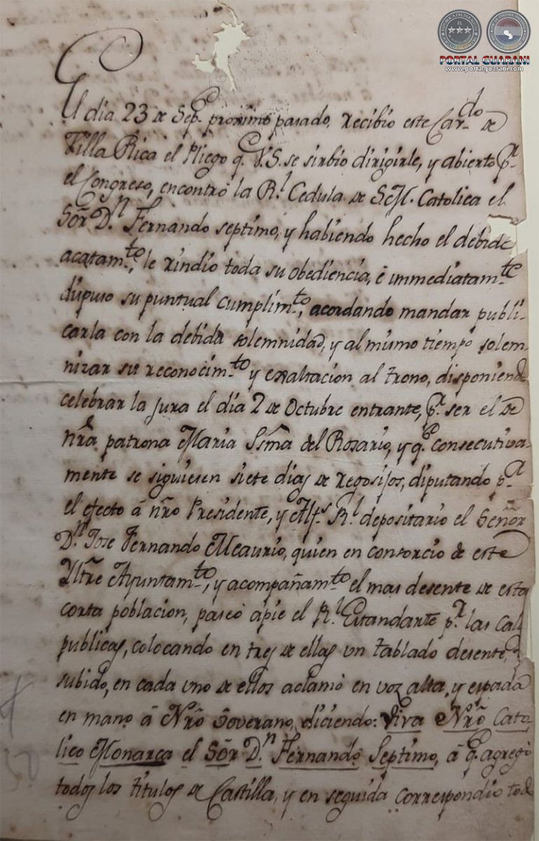 En contrapartida de las insurrecciones villarriqueñas señaladas, un documento de 1808, obrante en el Archivo Nacional de Asunción, designa, quizás por primera vez, como República a esta tierra y relata que en octubre de ese año las autoridades de Villa Rica del Espíritu Santo rindieron pleitesía durante «siete días y todas las noches» al rey, que se enarboló el Real Estandarte bajo custodia de soldados y se iluminaron las calles e iglesias al «son de desplegados instrumentos, y clarines, salvas y vivas», con juegos de corridas de toros, sortijas, «alistamiento a invención de Moros y Galanes, y otros Entremeses de por medio: saliendo las tres primeras noches el mismo Corrido en Caballos bailarines y en pasados con decente acompañamiento, y tropa correspondiente al paseo de la Risa y otros juegos que acostumbra esta República»; durante esos días, según el informe, «en medio de tanto tumulto y regocijo no se ha experimentado la más mínima desgracia». Al inicio de las fiestas, celebradas por la coronación del rey Fernando VII, el alférez real don José Fernando Meaurio «paseó a pie el Real Estandarte por las calles públicas, colocando en tres de ellas un tablado», y subió a ellos, «en voz alta y espada en mano á Nuestro Soberano, diciendo: Viva Nuestro Católico Monarca el Señor Don Fernando Séptimo, a que agregó todos los títulos de Castilla».
