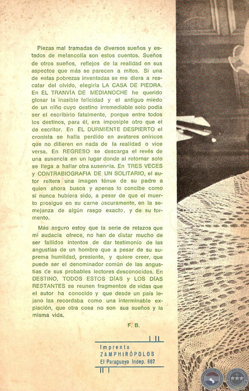 Lo podría ver en su destino mismo, pero no definirlo, situándolo por las postrimerías de 1918, cuando su juventud retaba y vencía a pie tos caminos a Luque, donde el tango y la hombría ciega sostenía el baile más campesino que arrabalero. Aunque no lo conocía entonces, lo retrato, porque cada hombre repetimos los mismos ciclos férreos y despiadados de la vida; lo veo en un regreso inquieto, acaso melancólico, por esas calles fantasmales de nuestra metrópolis amortajadas de luna o teñida de tinta negra con el lejano e imposible "foquito" columpiándose en el viento al cabo del túnel de la noche. Su sombra deslizándose por aceras de casas bajas coloniales efuminadas bajo la luz exigua de la C.A.L. T. después de la larga labor del periodista. Acaso sus días vividos, puedan cantarse menos en relación a las cuartillas que conocieron y conocen su nerviosa pluma incorruptible. De tarde y noche, durante años inquietos del civismo asunceno, su vida no ha sido sino ingente y sano periodismo. Nunca quiso ser muchos hombres. Su sueño y determinación confluyeron en llegar a ser siempre un solo y el mismo hombre, a pesar de los reveses y tumbos que fue ofreciendo el tiempo ingrato. Lo veo también por los inicios del 30 y tantos, cuando era Juez de Paz de Recoleta y reiteraba cada mañana y algunas tardes su trayecto por la calle España hasta Luna, a espaldas de la Curva San Miguel, punto inicial de confines residenciales, quintas aledañas y gritos desteñidos en el ocaso. Cuando decir Sarmiento y República Francesa significaba remontar la imaginación hacia melancólicos arrabales vespertinos. Acaso con una luna enorme en el fondo de la calle, sobre el caserío. No se descarta desde luego, que alguna lluvia, o el espectáculo de guaviramí y limoneros en flor, hayan perfumado sus horas, punzándolo de esa ternura que la vida promete y no confiere.